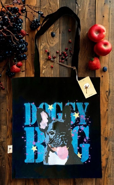 Handlenett i økologisk bomull til alle dine matvarer. Handlenett "Doggybag" Handlenett i 100% økologisk bomull. Sort med print. Tåler vask 40 grader. Perfekt til handleturen eller som veske. PrisNOK300,00 inkl. mva. På lager Kjøp Ønskeliste Del dette