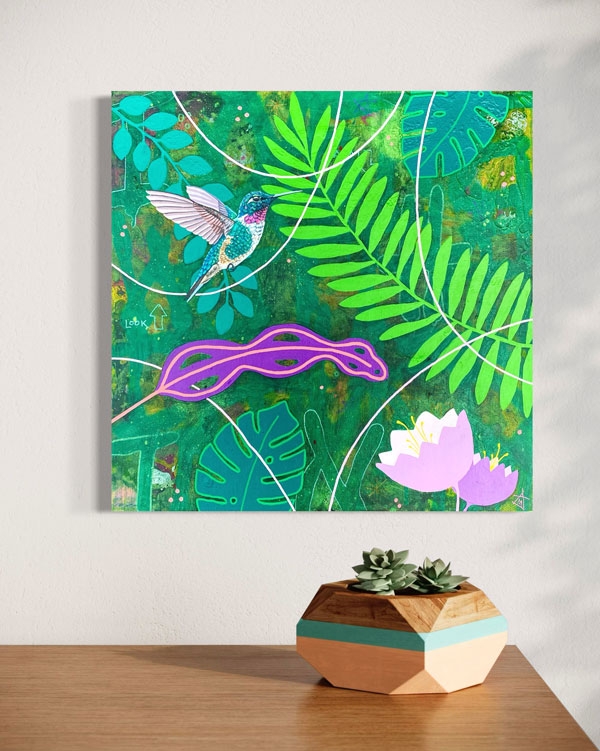 Urban jungel med en colibri. Neon elementer. Sorte kanter rundt lerretet. Interiør med maleriet Urban jungle. Colibri som svever i en jungel. Urban Jungle Akryl på lerret. 40x40cm. PrisNOK8 000,00 inkl. mva. På lager Kjøp Ønskeliste Del dette Produktinfo Signert både på forsiden og baksiden. Laget på kvalitetslerret og med proffesjonell akrylmaling. Maleriet har streng bak for enkelt oppheng. Kantene er malt sort.